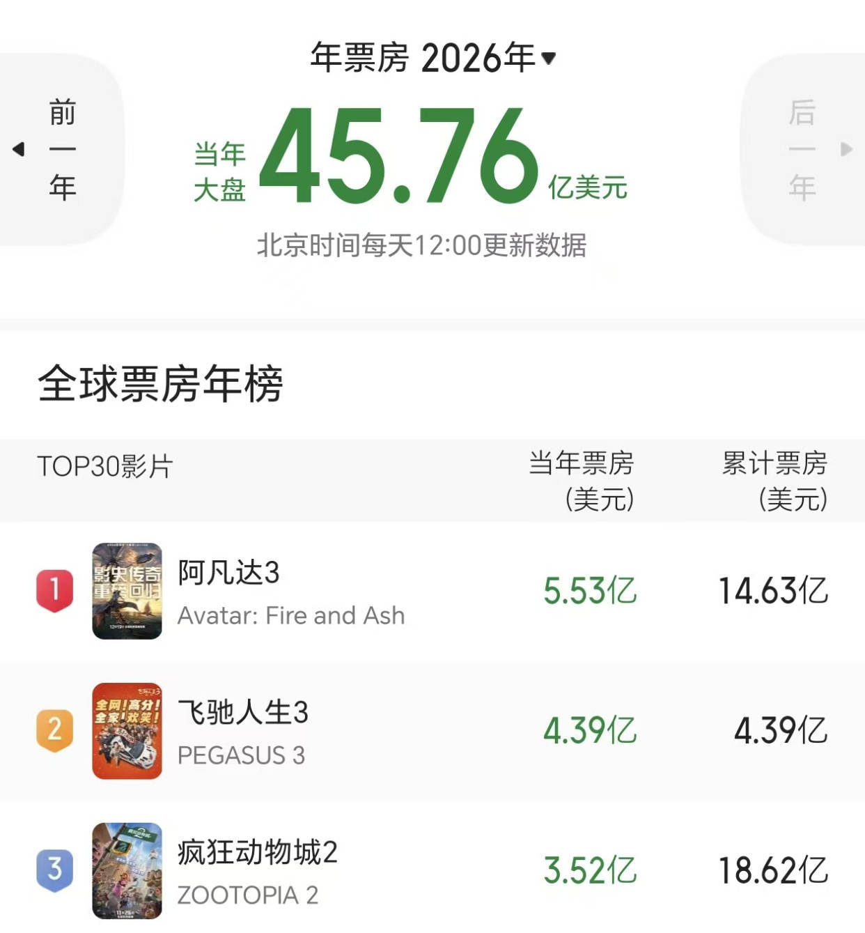 《阿凡达3》是于去年的12月19日开始上映,全球累计总票房是14.61亿美元,而其中有5.53亿美元都是来自今年。