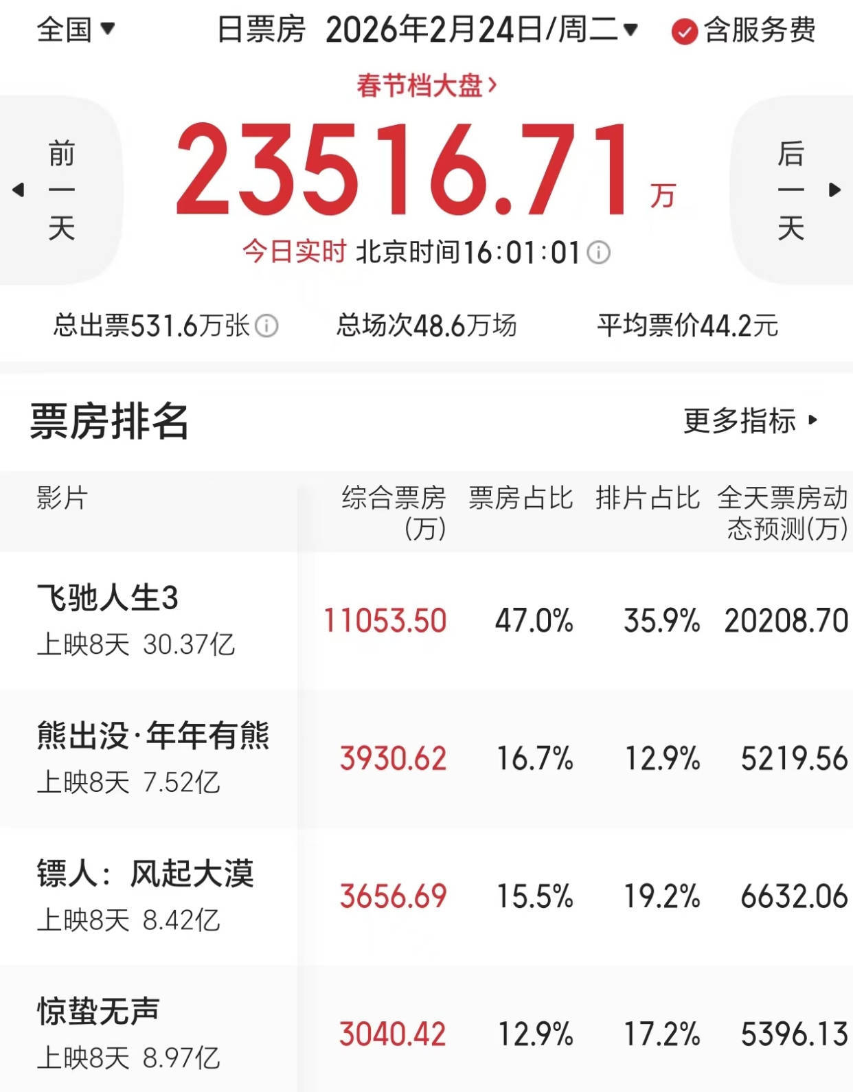 据国内电影平台显示,春节档过后的第一天,也就是2月24日,目前就只有《飞驰人生3》的单日票房超过了1亿人民币。而其它电影,像《熊出没之年年有熊》《镖人》还有《惊蛰无声》等,各自的单日票房却还没有达到5000万人民币,都远不及《飞驰人生3》的一半。