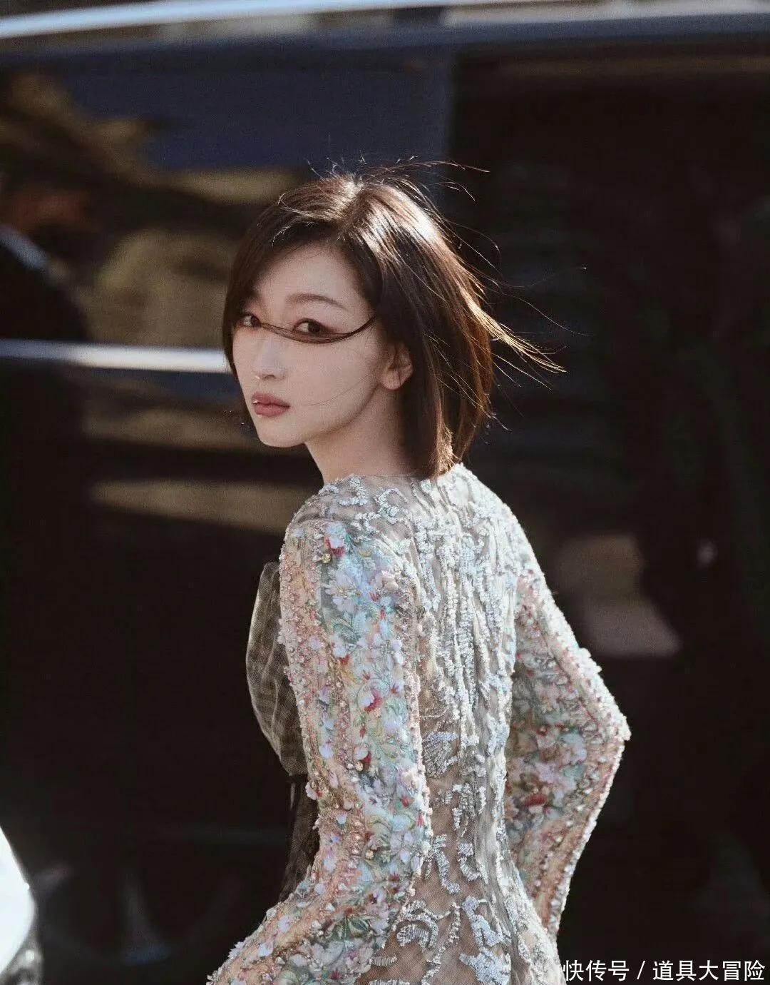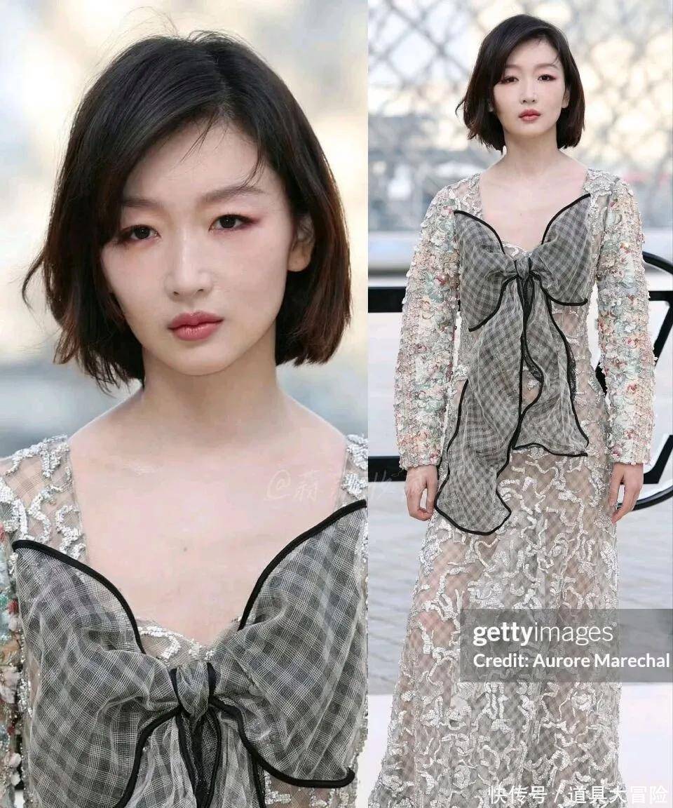 周冬雨银白亮片透视长裙,胸前巨型黑灰蝴蝶结,短发加持,甜酷参半。流光溢彩如星河,柔裙与短发的碰撞,记忆点十足。