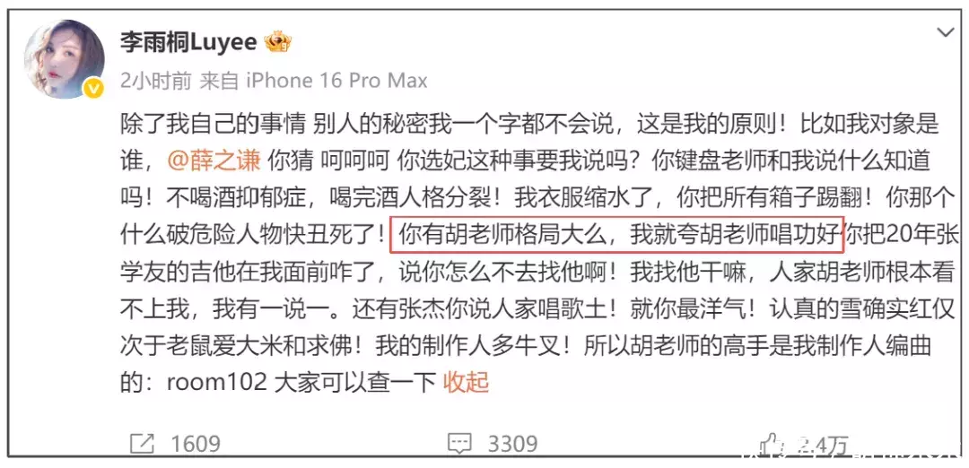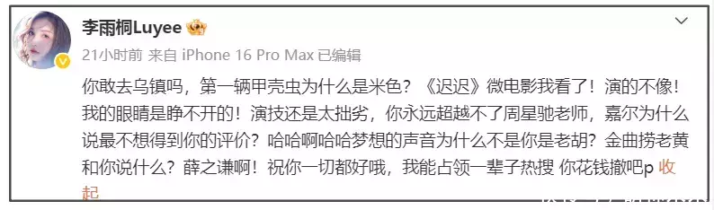 李雨桐还吐槽薛之谦演技差,超越不了周星驰老师。还拿王嘉尔不想得到薛之谦的评价拉踩他,之后晒了与王嘉尔唱K的画面,说帮王嘉尔打歌,被怼别蹭流后,她还说王嘉尔同意,一副两人很熟的样子。