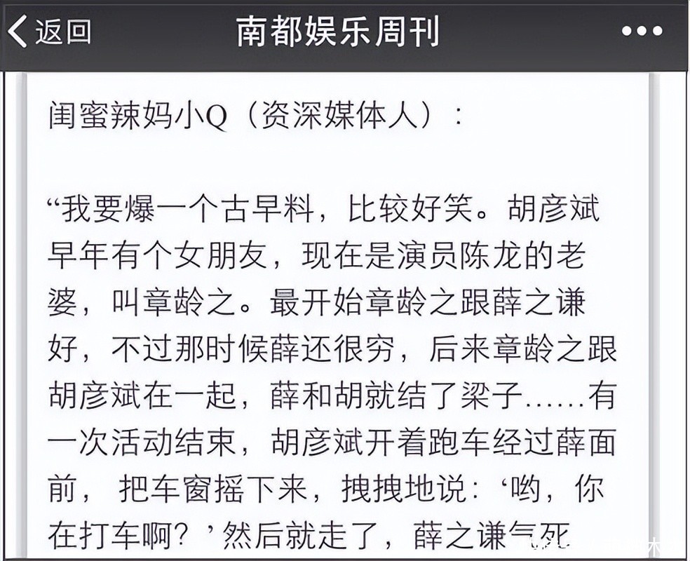 而胡彦斌为何这样?原因是有爆料称薛之谦胡彦斌曾先后与章龄之恋爱,当时薛之谦穷,章龄之就跟胡彦斌恋爱了,两人因此结下梁子,后来胡彦斌还在跑车上羞辱薛之谦。