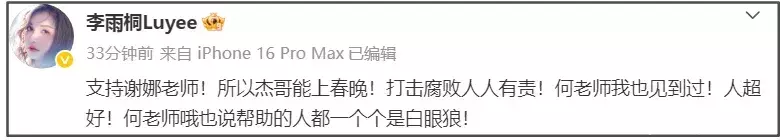 李雨桐看到谢娜的行为后发文支持,并夸赞何老师人超级好,表示“何老师也说帮助的人都一个个的白眼狼”,再次倒油薛之谦。当年,薛之谦和何炅录节目,何炅一直在节目上夸薛之谦努力,很拼命的抓住所有机会,然而事后薛之谦却基本没怎么上过 《快本》。