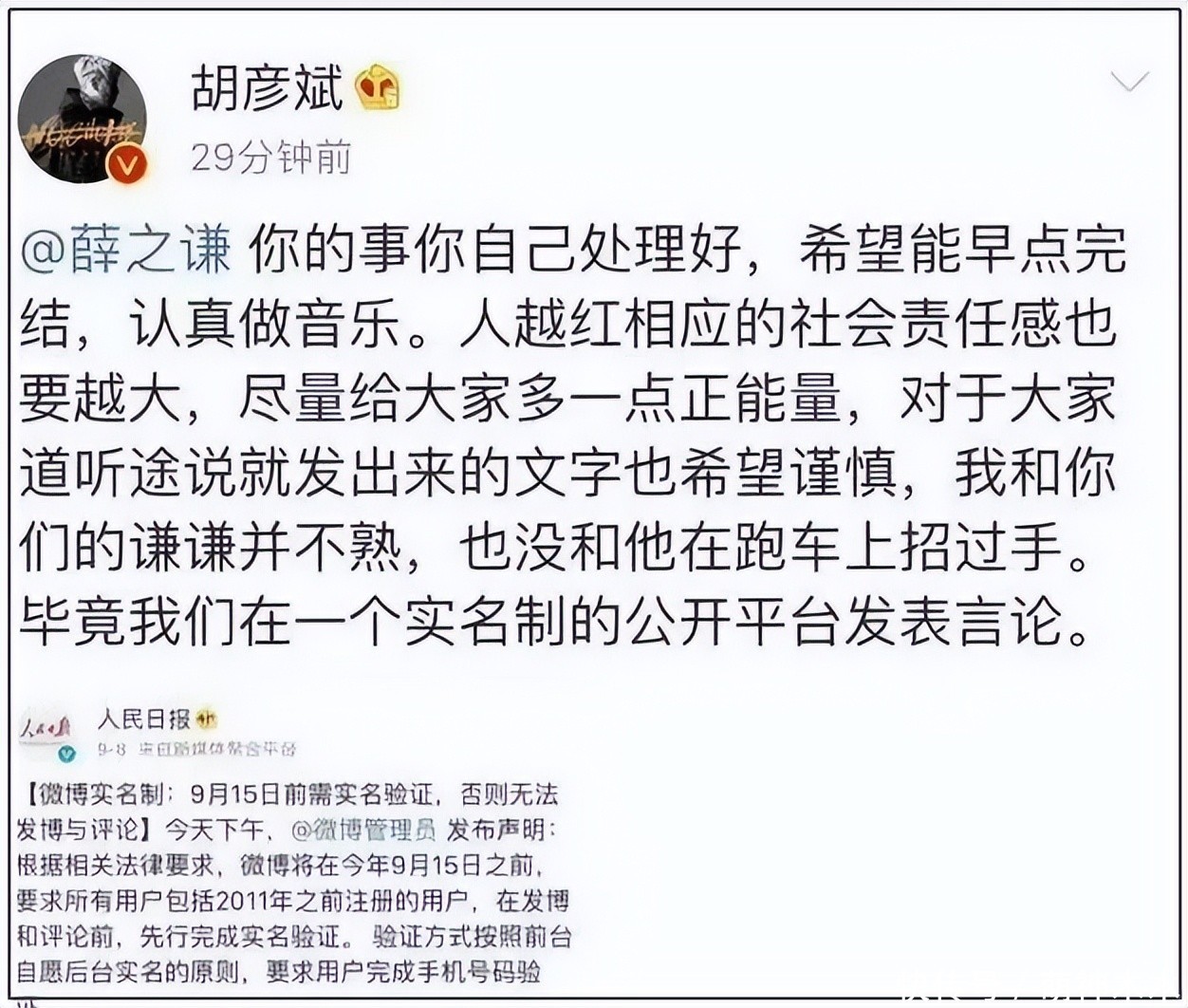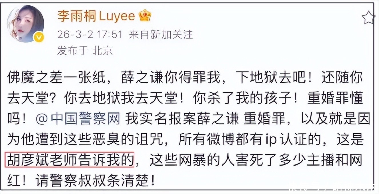 薛之谦和胡彦斌的恩怨情仇相当深,两人多年零互动,但是互相倒油毫不手软。此次李雨桐爆料中特意提到“胡彦斌告诉大家微博是实名的”,这句跟胡彦斌当年发文喊话薛之谦的博文相互呼应,当时李雨桐正锤薛之谦,胡彦斌就艾特薛之谦说不熟,让他处理好私事,顺便辟谣小道消息。