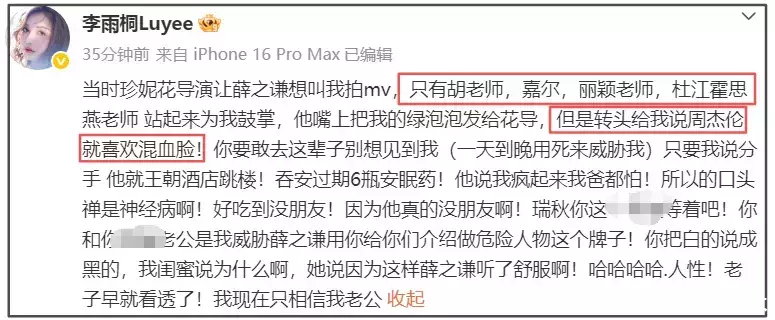 李雨桐还晒出了跟珍妮花导演的聊天记录,证实自己当年参与了《丑八怪》MV的拍摄。她称当时导演让薛之谦叫她拍,只有胡彦斌、王嘉尔、赵丽颖、杜江霍思燕为她鼓掌,而薛之谦表面奉承私下变脸,还暗自吐槽周杰伦喜欢混血脸。